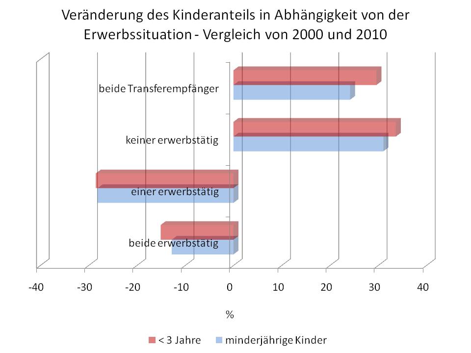 Kinder sehen sich immer häufiger mit Eltern konfrontiert, die nicht erwerbstätig sind. Während die Anzahl der Kinder, die mit zwei erwerbstätigen Elternteilen aufwachsen bzw. bei denen mindestens ein Elternteil (in der Regel ihr Vater) einer geregelten Arbeit nachgeht, im Vergleich der beiden Jahre zurückgeht, ist die Anzahl der Kinder, die mit nicht-erwerbstätigen Eltern konfrontiert sind, gestiegen. In Zahlen: 7.878.000 minderjährigen Kindern mit zwei erwerbstätigen Eltern im Jahre 2000 stehen 6.871.000 minderjährige Kinder mit zwei erwerbstätigen Eltern im Jahre 2010 gegenüber, 5.721.000 minderjährigen Kinder, die in 2000 mit mindestens einem Elternteil, das einer Arbeit nachgegangen ist, konfrontiert waren, stehen 4.110.000 minderjährige Kinder mit einem erwerbstätigen Elternteil im Jahre 2010 gegenüber. Dagegen ist die Anzahl der Kinder, die mit keinem arbeitenden Elternteil konfrontiert sind, von 1.593.000 im Jahre 2000 auf 2.088.000 im Jahre 2010 gestiegen. Berechnet man die Veränderungsraten der soeben beschriebenen Entwicklung, dann ergibt sich das in der folgenden Abbildung dargestellte Bild.
