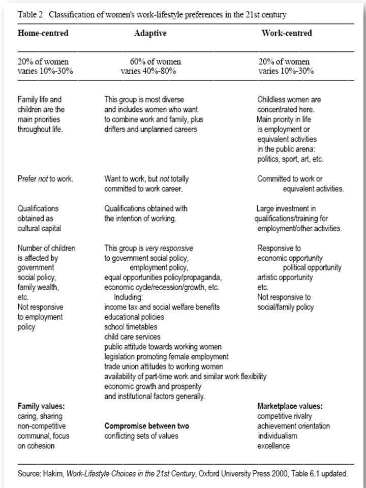 Catherine Hakim hat bereits in den 1990er Jahren eine Reihe von Forschungen veröffentlicht, deren einheitliche Aussage man wie folgt zusammenfassen kann: rund 30% der Frauen sind „committed to work“, weitere rund 30% der Frauen „prefer not to work“. Zwischen beiden Gruppen lavieren die Unentschlossenen, Frauen, die noch nicht entschieden haben, ob sie lieber arbeiten wollen oder nicht, Frauen, die einen Anreiz benötigen, um sich entweder für die eine oder die andere Seite zu entscheiden. Nun, welche Form von Anreiz stellen wohl Zahlungen für Fertilität, wie sie der deutsche Staatsfeminismus in unglaublicher Höhe bereitstellt, dar? Welchen Anreiz stellen die finanziellen Rechte, die Mütter einklagen können, ihre Ansprüche auf staatliche Alimentierung, die sie allein dadurch erzielen, dass sie fertil sind, dar? Ich denke, kaum jemand der bei normalen Sinnen ist, wird bestreiten, dass die entsprechenden Anreize alle dahin gehend wirken, die Unentschlossenen gegen ein „commitment to work“ und für „not to work“ zu bewegen. Das ist eigentlich alles ganz einfach und seit der Forschung von Hakim auch bekannt. Die Abbildung zeigt eine Klassifikation der Präferenzen von Frauen im 21. Jahrhundert, die Catherime Hakim bei einem Vortrag verteilt hat. Der komplette Handout des Vortrags kann auf den Seiten der Campaign for Merit in Business heruntergeladen werden.