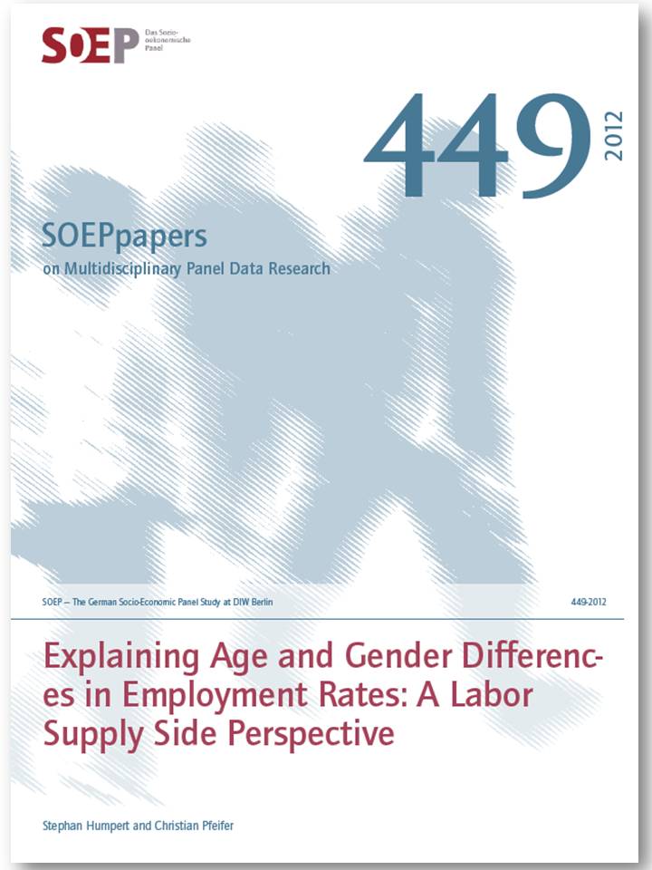 Humpert, Stephan & Pfeifer, Christian (2012). Explaining Age and Gender Differences in Employment Rates: A Labor Supply Side Perspective. Berlin: DIW, SOEPpapers on Multidisicplinary Panel Data Research #449.