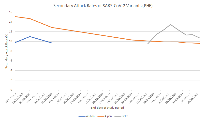 Die Zahlen, die PHE-England auf Basis dieser Definition von „Secondary Attack Rate“ für Haushalte berechnet, nehmen die Lockdown Sceptics in England wiederum zur Hand und tippen sie in eine Datei, um eine Verlaufsgraphik zu erstellen, die die Entwicklung der Secondary Attack Rate für die in England vorherrschenden Varianten zeigt. Die aktuelle Abbildung sieht so aus: