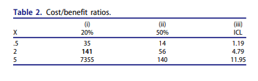 Wir wissen bereits, dass die Lockdowns in Kanada 6.283.333 Lebensjahre gekostet haben. Diese verlorenen Lebensjahre setzt Allen nun zu dem in Relation, was angeblich durch Lockdowns an Lebensjahren gerettet worden sein soll. Die entsprechenden Zahlen variieren je nach Modell zwischen 44.430 (für X = 2, also zwei Monate Lockdown) Lebensjahren bei 20% durch Lockdown weniger an COVID-19 Verstorbenen, 111.081 Lebensjahren bei 50% durch Lockdown weniger an COVID-19 Verstorbenen und 1.311.760 weniger an COVID-19 Verstorbenen im lächerlichen Modell des Imperial College London. Egal, mit welchem der Modelle gerechnet wird, immer übersteigen die Kosten für einen Lockdown dessen Nutzen um ein Vielfaches, wie die folgende Tabelle zeigt. Die Werte in der Tabelle geben für die drei Modelle und für zwei Wochen (.2), zwei Monate und fünf Monate an, wie viel mehr Kosten ein Lockdown im Vergleich zu seinem Nutzen, der in LEBENSJAHREN gerechnet wurde, erbracht hat.