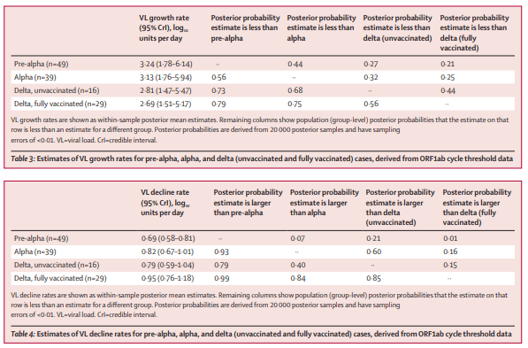 Der obere Teil der Tabelle zeigt, dass im Vergleich zu einer Infektion mit dem Wild-Typ (pre-Alpha) von SARS-CoV-2 alle nachfolgenden SARS-CoV-2 Varianten ein langsameres Wachstum der viralen Ladung zeigen, d.h. die Infektiosität ist, gemessen an diesem Datum, im Verlauf der SARS-CoV-2 Mutationen immer geringer und nicht etwa höher geworden. Der Unterschied zwischen Geimpften und Ungeimpften im Hinblick auf die Zunahme viraler Ladung und damit einhergehender Infektiosität ist vernachlässigbar. Das mag erklären, warum es, wenn es darum geht, andere anzustecken, keinen Unterschied zwischen infizierten Geimpften und Ungeimpften gibt. Der zweite Teil der Tabelle zeigt, dass Geimpfte im Vergleich zu Ungeimpften SARS-CoV-2 etwas schneller aus ihrem Organismus beseitigen können. Die Virenladung reduziert sich bei Geimpften etwas schneller als bei Ungeimpften. Das mag der Grund dafür sein, dass Geimpfte eine geringere Wahrscheinlichkeit haben, mit COVID-19 hospitalisiert zu werden. Indes ist der Unterschied so minimal und der Impfschutz, den COVID-19 Impfstoffe bereitstellen, so flüchtig und in vielen Fällen so gering, dass man auf Grundlage der Ergebnisse von Singanayagam et al. (2021) den Sinn von Impfung zumindest bezweifeln muss – ohne Berücksichtigung von Nebenwirkungen, die durch Impfung verursacht werden.