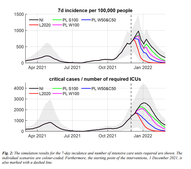 „The exclusion of unvaccinated students from classes in schools proved to be the least effective of the measures considered. Working from home of all unvaccinated workers was found to be somewhat more effective. According to our Scenario PL W50&C50, a very good mitigation of the fourth wave can be achieved by a combination of working at home and restricting leisure contacts of the unvaccinated population. Here, the maximum number of intensive care beds required is only slightly higher than in the hard lockdown of Scenario L2020. The total number of infections could also be significantly reduced in our simulation by the two measures described. Scenario PL W50&C50 thus also shows that no additional restrictions on the vaccinated population are required for a drastic mitigation of the fourth wave.“