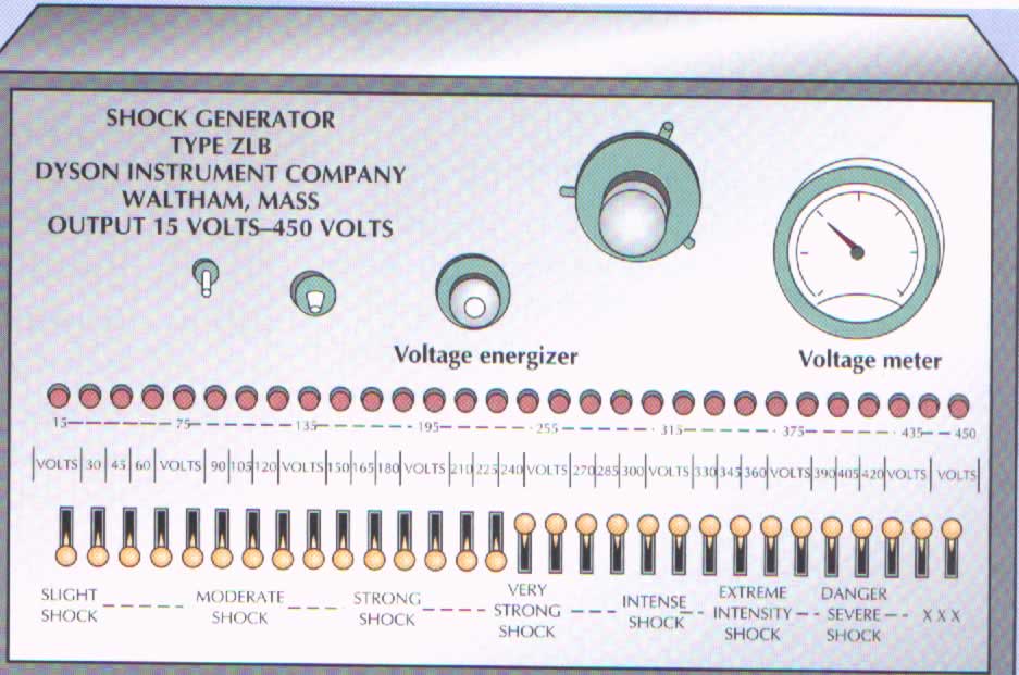 Damit Sie eine Vorstellung von den Schmerzen haben, die Herr Schmidt durch die elektrischen Schocks erleiden wird, gibt Ihnen der Leiter des Experiments einen leichten Stromschlag. Er führt Sie anschließend in den Kontrollraum, in dem Sie vor dem Schock-Generator Platz nehmen. Die Maschine hat 30 Schalter, die von 15 Volt bis 450 Volt reichen, über dem Schalter für 15 Volt steht: „leichter Schock“ über dem Schalter für 450 Volt steht „XXX“.