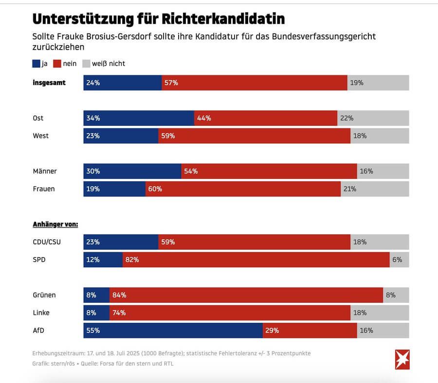 Der Stern, dessen fortwährende Existenz an sich schon die Krise des deutschen Journalismus auf den Punkt bringt, hat FORSA, eines der Umfrageinstitute, die, wenn es darum geht, gewünschte Ergebnisse zu forcieren, am geeignedsten sind, mit einer Befragung zur Kandidatur von Brosius-Gersdorf für […]